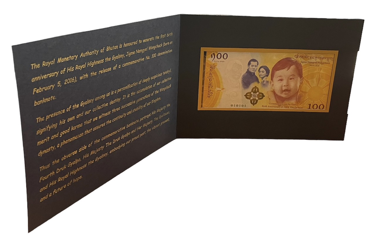 Бутан 100 нгултрумов 2016 1-ый год рождения принца Гьялси Джигме Намгьела Вангчука, в оригинальном буклете Pick 37 a бумага UNC (пресс) 446-52-1