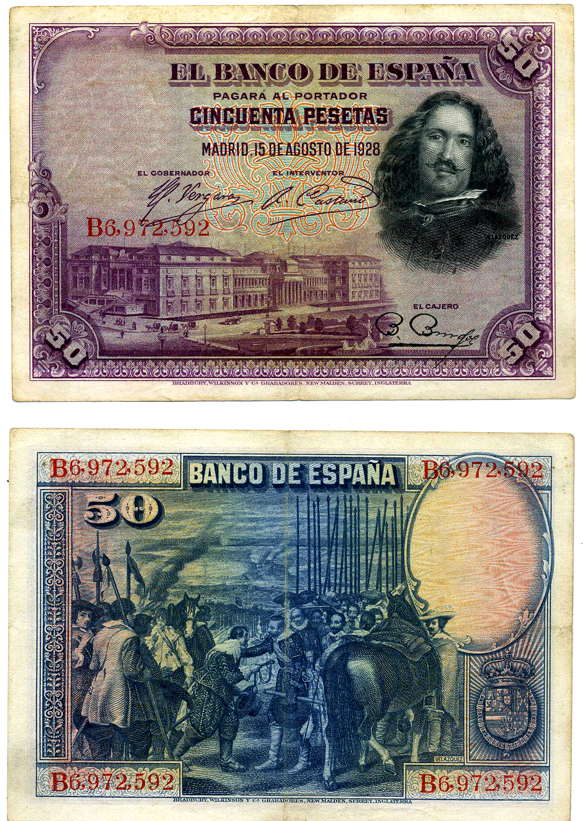 Испания 50 песет 1928 15 августа 1928, серия В, ДИЕГО ВЕЛАСКЕС, МУЗЕЙ ПРАДО В МАДРИДЕ Pick 75b бумага VF-XF 8603-19-2-1