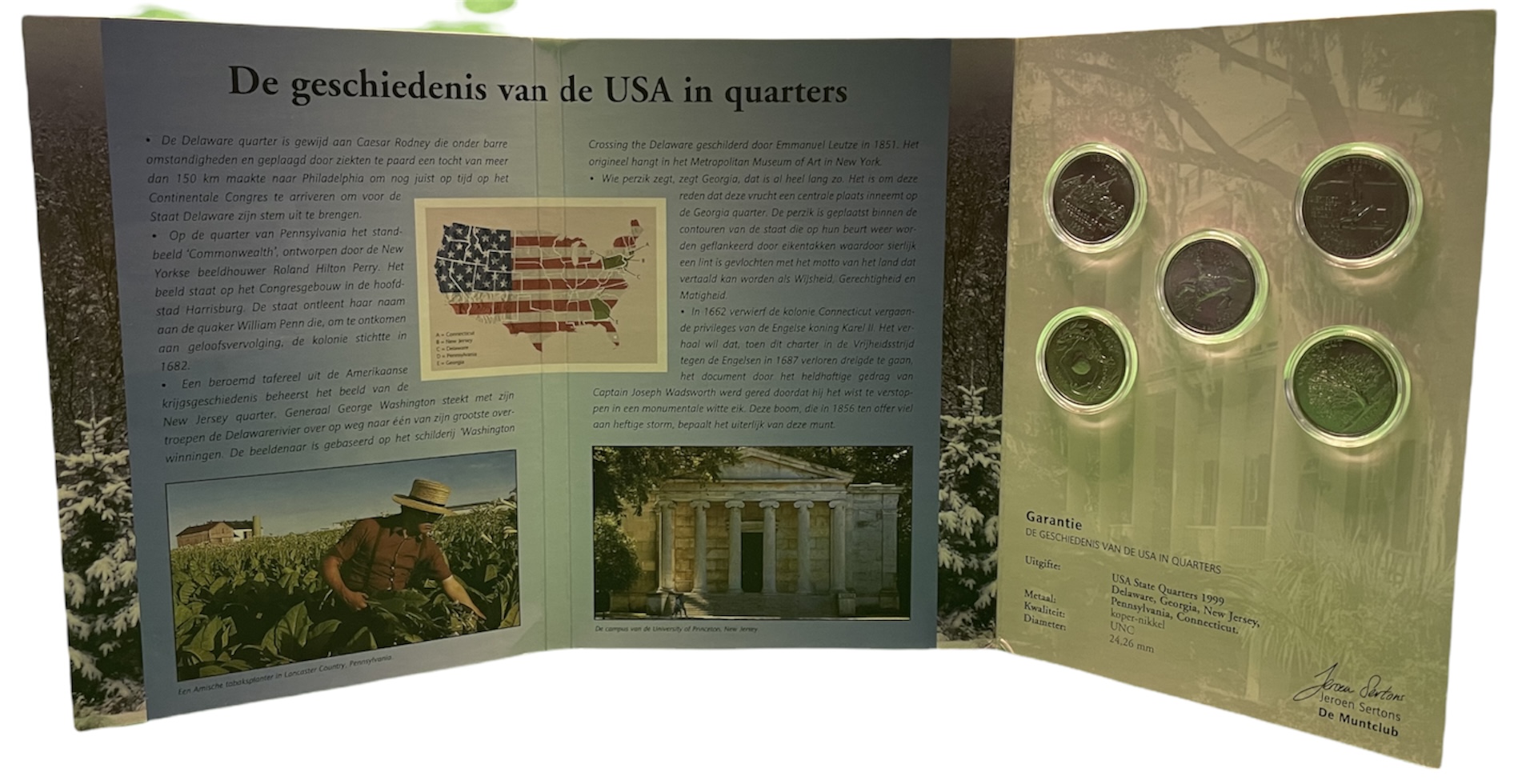 США набор из 5 квотеров 1999 штаты США: Нью-Джерси, Делавер, Джорджия, Коннектикут, Пенсильвания, буклет, капсулы, сертификат KM 295, 293, 296, 297, 294 медно-никель UNC 7-6-1-28