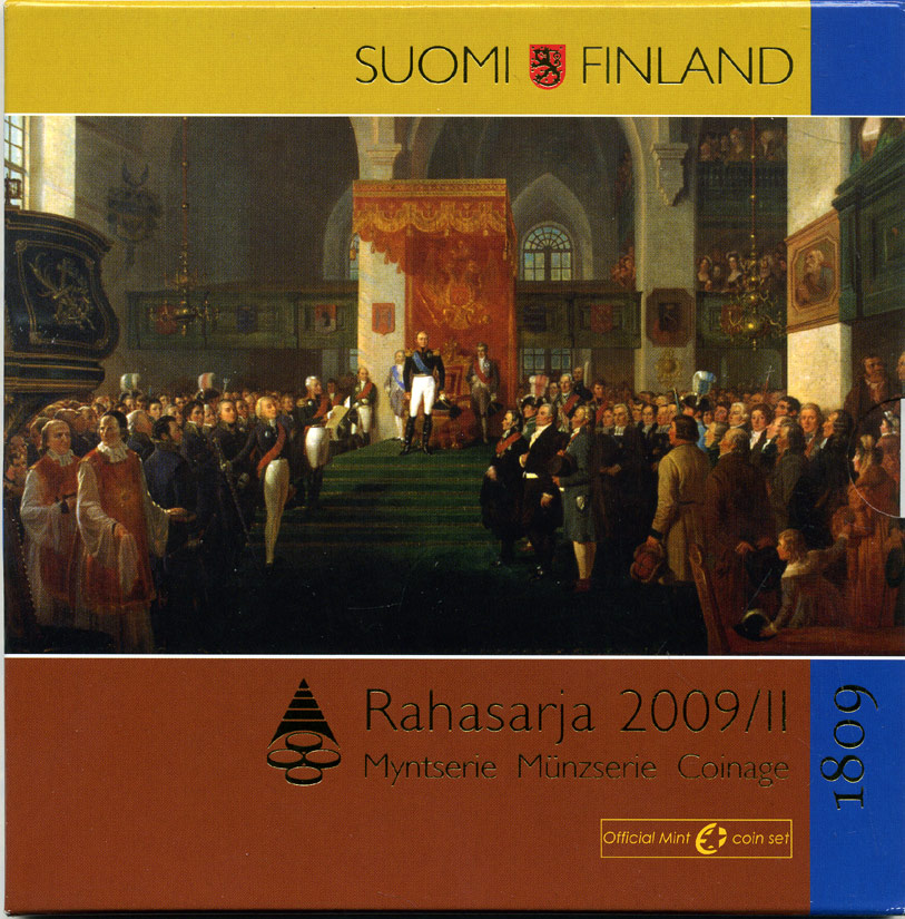 Финляндия евронабор из 8 монет + 2 евро юбилейная 2009 200 лет автономии (1809-2009), официальный набор в оригинальном буклете UNC 5-6-2-12