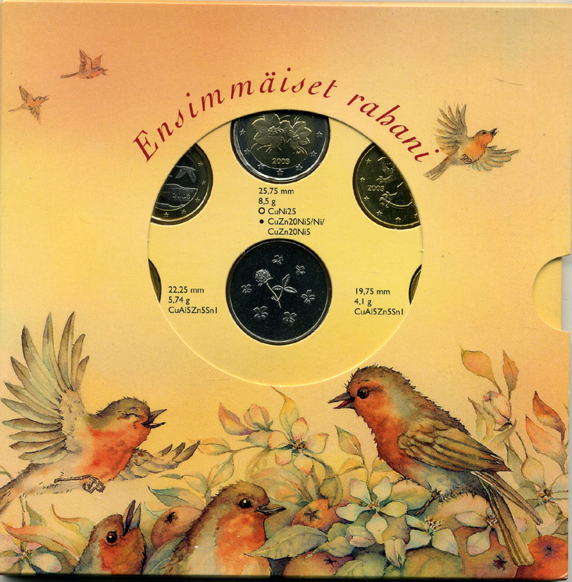 Финляндия евронабор из 8 монет + жетон 2003 птицы, официальный набор в оригинальном буклете UNC 5-6-2-23