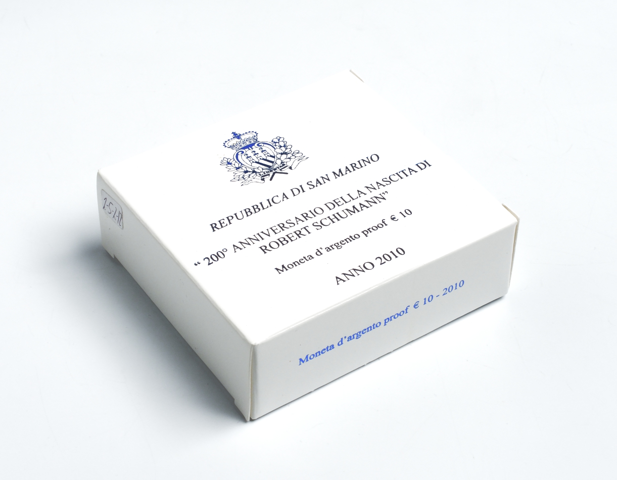 Сан-Марино 10 евро 2010 200 лет со дня рождения Роберта Шумана, коробка, сертификат KM NEW серебро PROOF 2-5-2-12