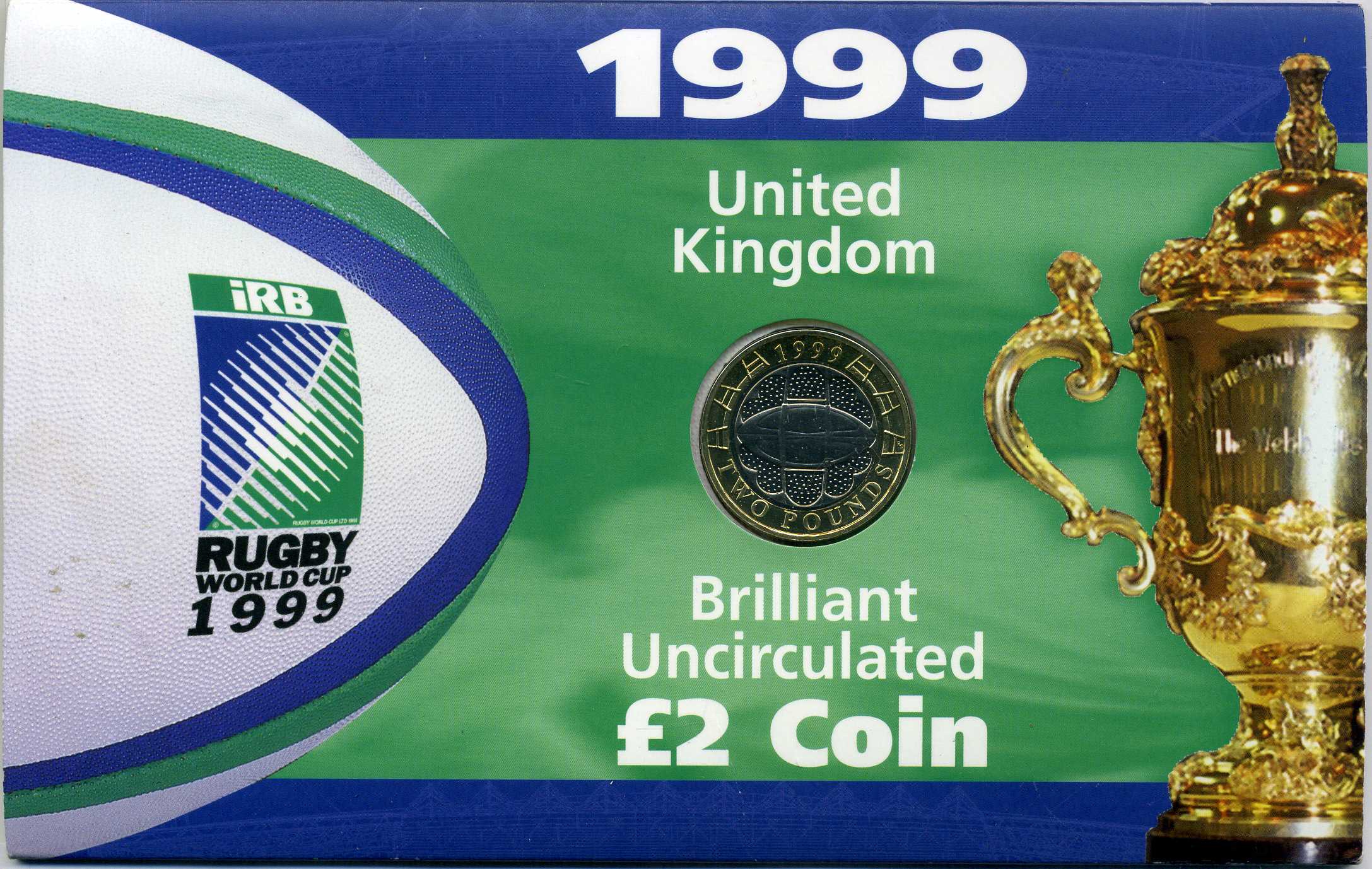 Великобритания 2 фунта 1999 Елизавета II (1952-2022), Чемпионат мира по регби, в оригинальном картонном буклете KM 999, Spink 4571 (K10) биметалл BUNC 3-4-4-46