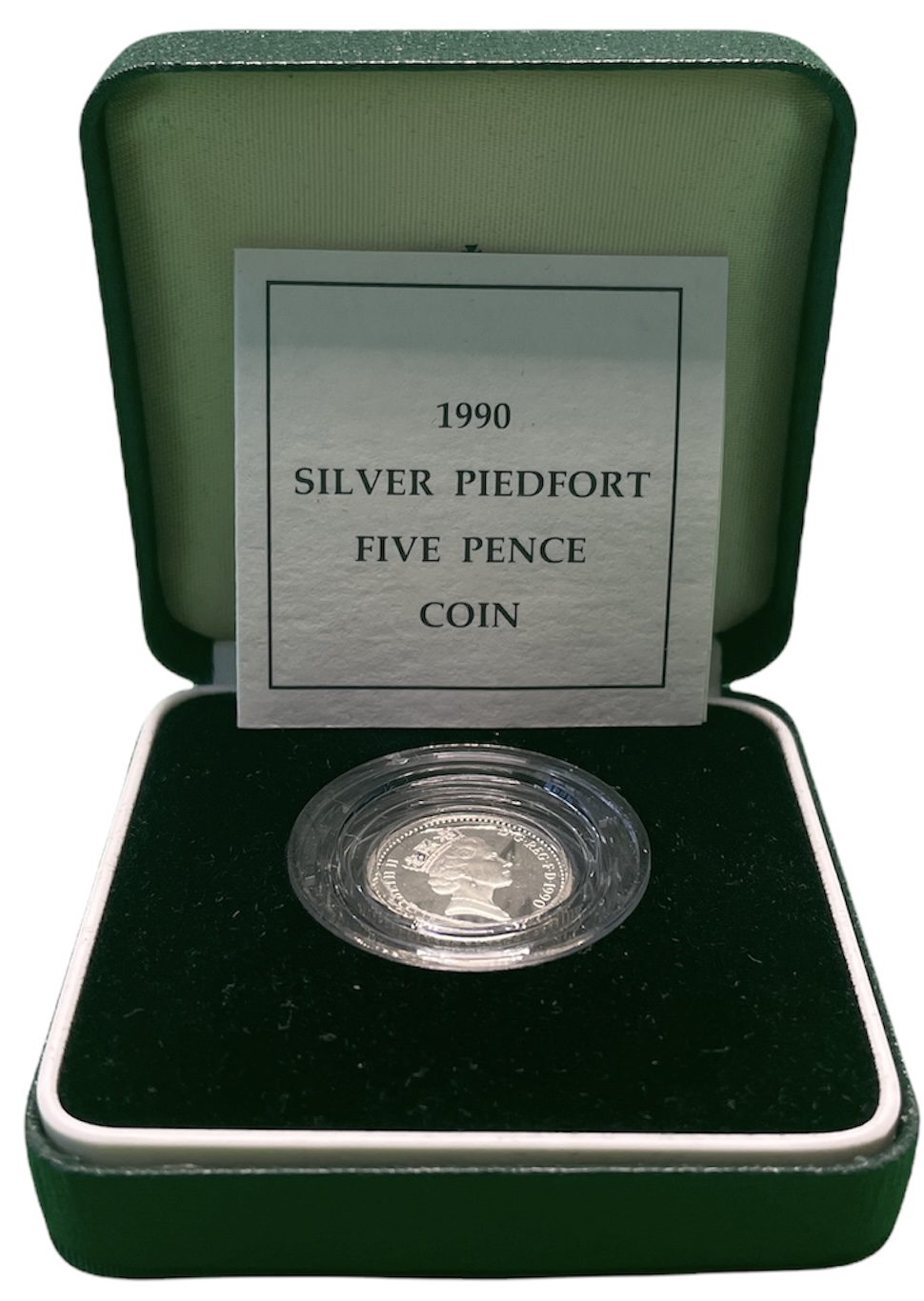 Великобритания 5 пенсов 1990 Елизавета II (1952-2022), в оригинальной коробке, с сертификатом KM 937c, Spink 4372 серебро PROOF 5-6-4-7