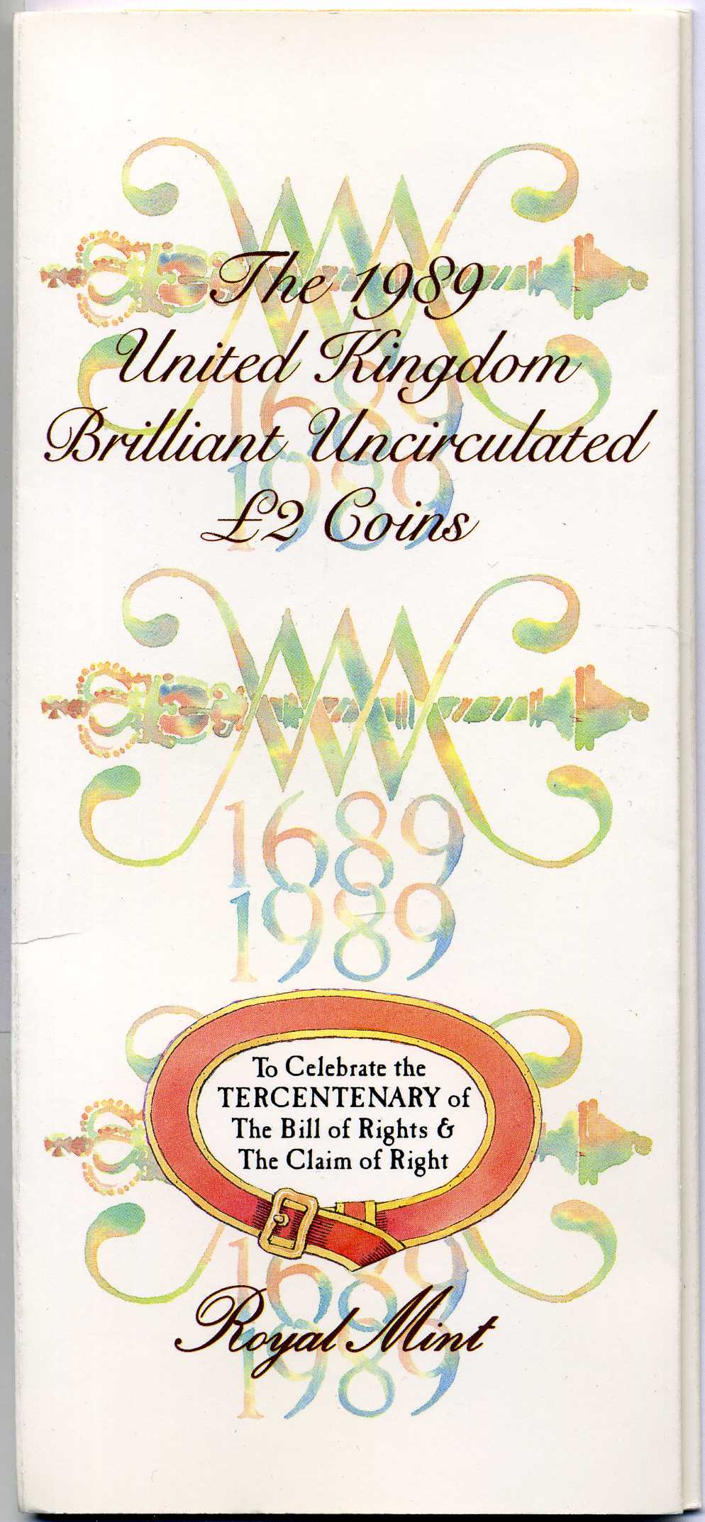 Великобритания набор из 2 монет по 2 доллара 1989 300 лет Биллю о правах, 300 лет Праву престолонаследования, в оригинальном картонном буклете KM 960, 961, Spink никель латунь BUNC 5-4-4-31