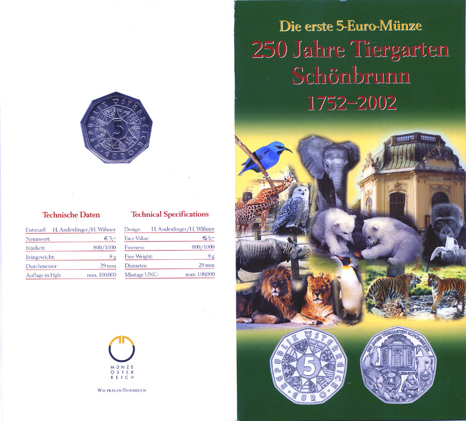 Австрия 5 евро 2002 250 лет Шенбруннскому зоопарку, в оригинальном буклете KM 3091 серебро UNC 7-6-1-39
