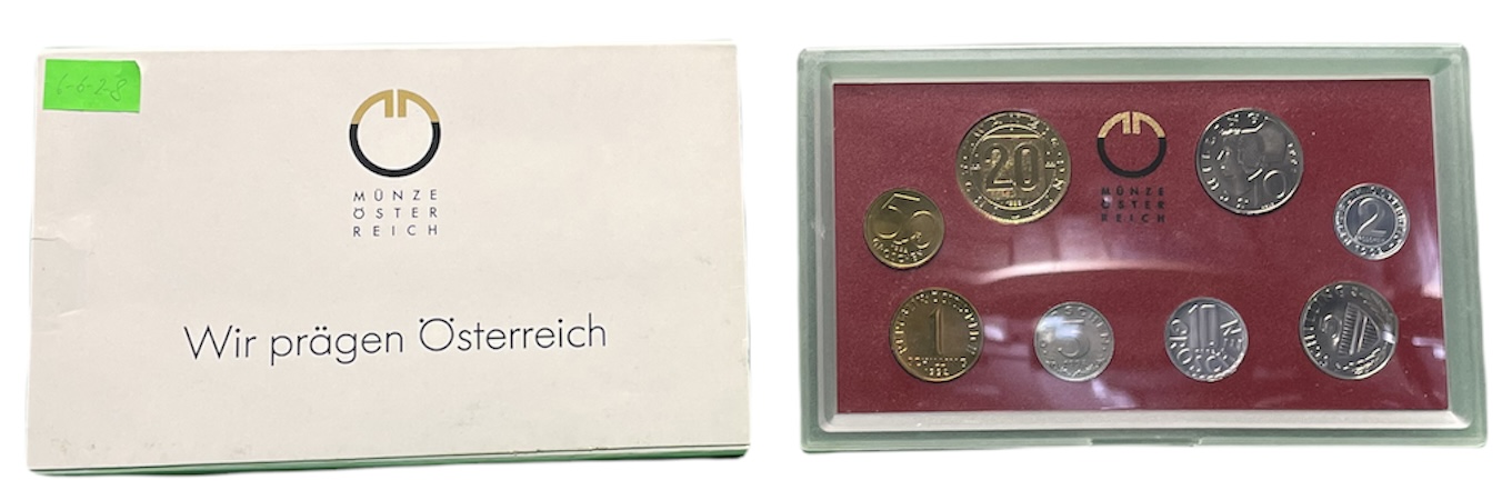 Австрия набор из 8 монет 1992 официальный набор, 2, 5, 10, 50 грошей, 1, 5, 10, 20 шиллингов, девять провинций Австрии, в пластике KM MS 1 UNC 6-6-2-8