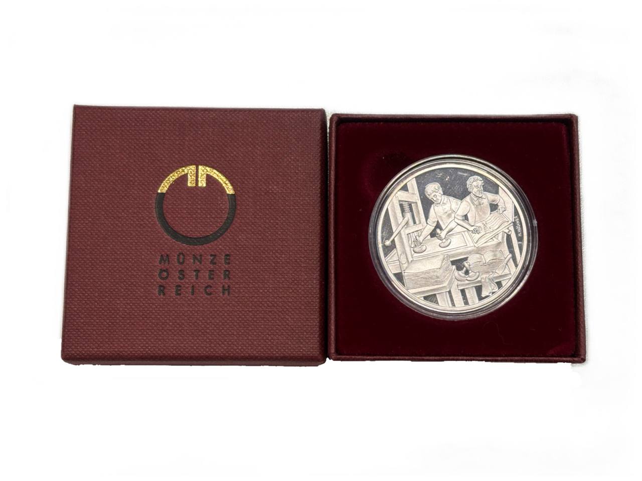 Австрия 500 шиллингов 1998 Книгопечатание, Библиотека аббатства Адмонт, печатники, в оригинальной упаковке, с сертификатом KM 3049 серебро PROOF 8-2-05-25