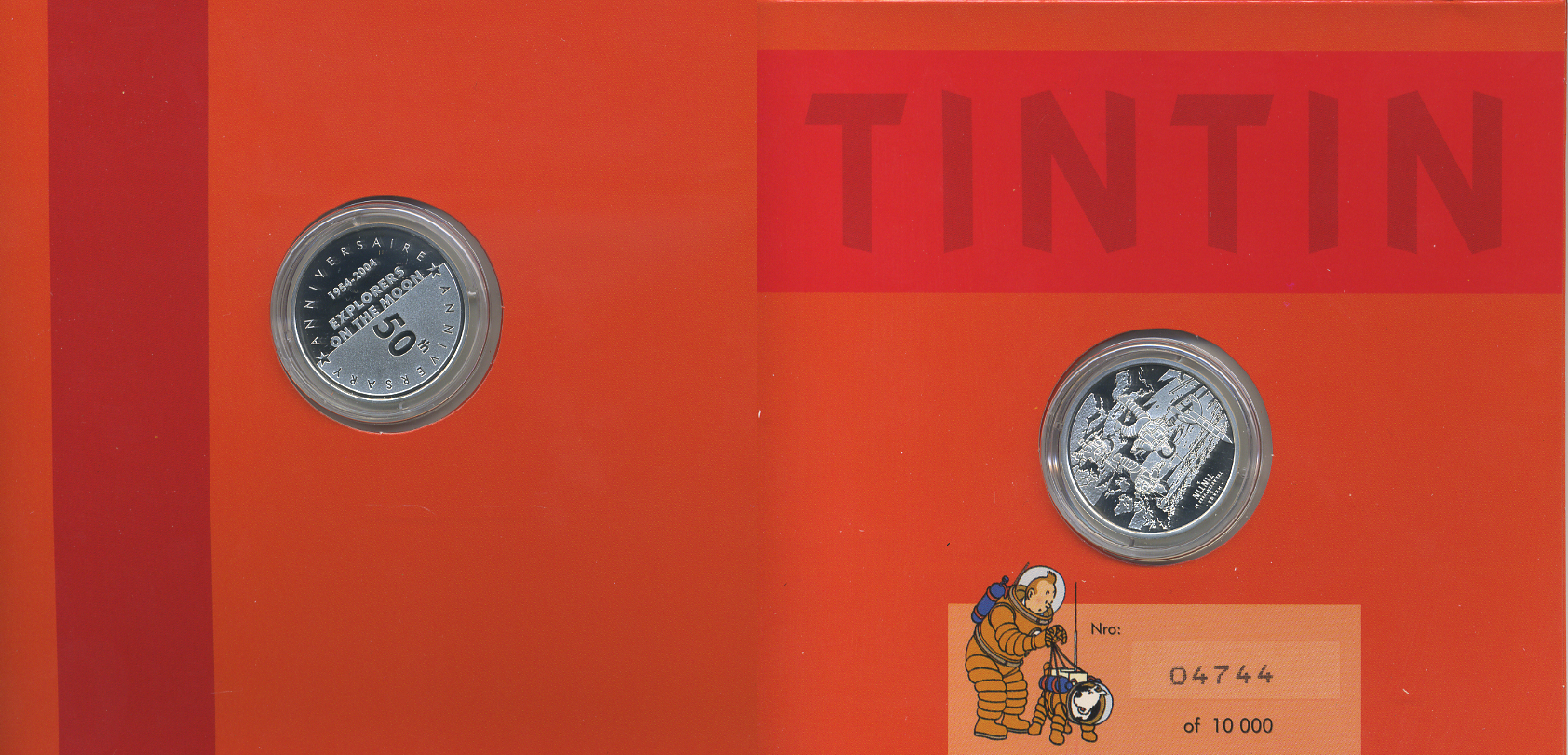 Бельгия набор из 24 монет + жетон 2004 50 лет первой ракете на Луне, TINTIN, 12 монет по 1 евроценту и 12 монет по 2 евроцента, тираж 10000 экз., жетон серебро, в оригинальном буклете, с сертификатом UNC 1-5-3-21