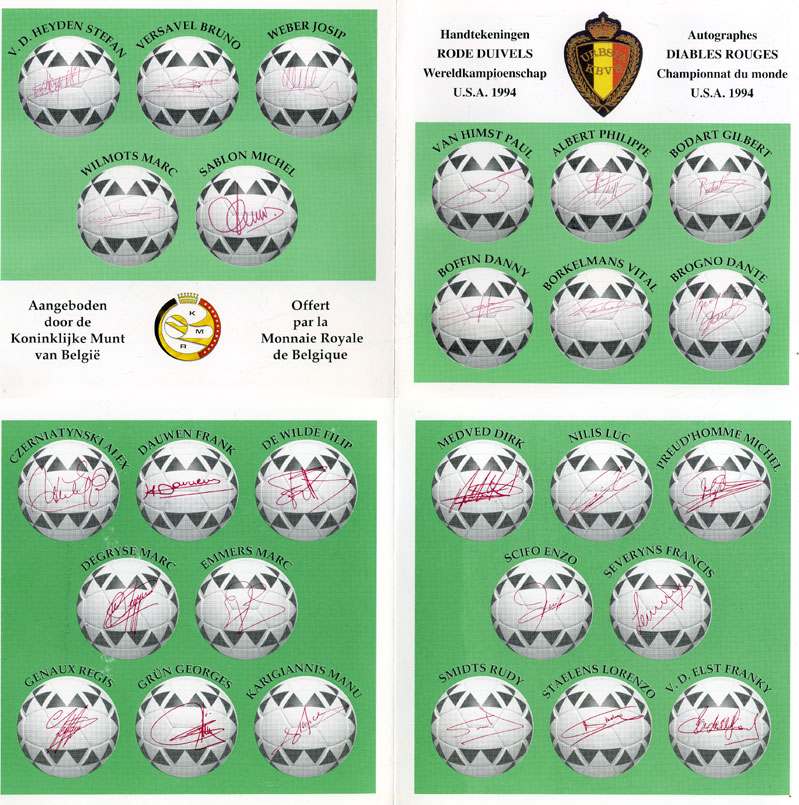 --Бельгия набор из 10 монет + жетон монетного двора 1994 Belgie-Belgique, Чемпионат мира по футболу в США 1994 года, с подписями сборной Бельгии и фотографиями игроков, в оригинальном буклете, в запайке KM MS 6 BUNC 6-5-3-46НовинкиАнтичность и раннее СредневековьеМонеты - ГерманияМонеты - ЕвропаМонеты - Австралия и ОкеанияМонеты - АзияМонеты - АмерикаМонеты - АфрикаМонеты - Россия, СССР, страны СНГ и БалтииБанкнотыАксессуары, ЛитератураОткрытки, карточкиАкции, облигацииЖетоны, Медали, ЗнакиМаркиКартины, декоративно-прикладное искусство