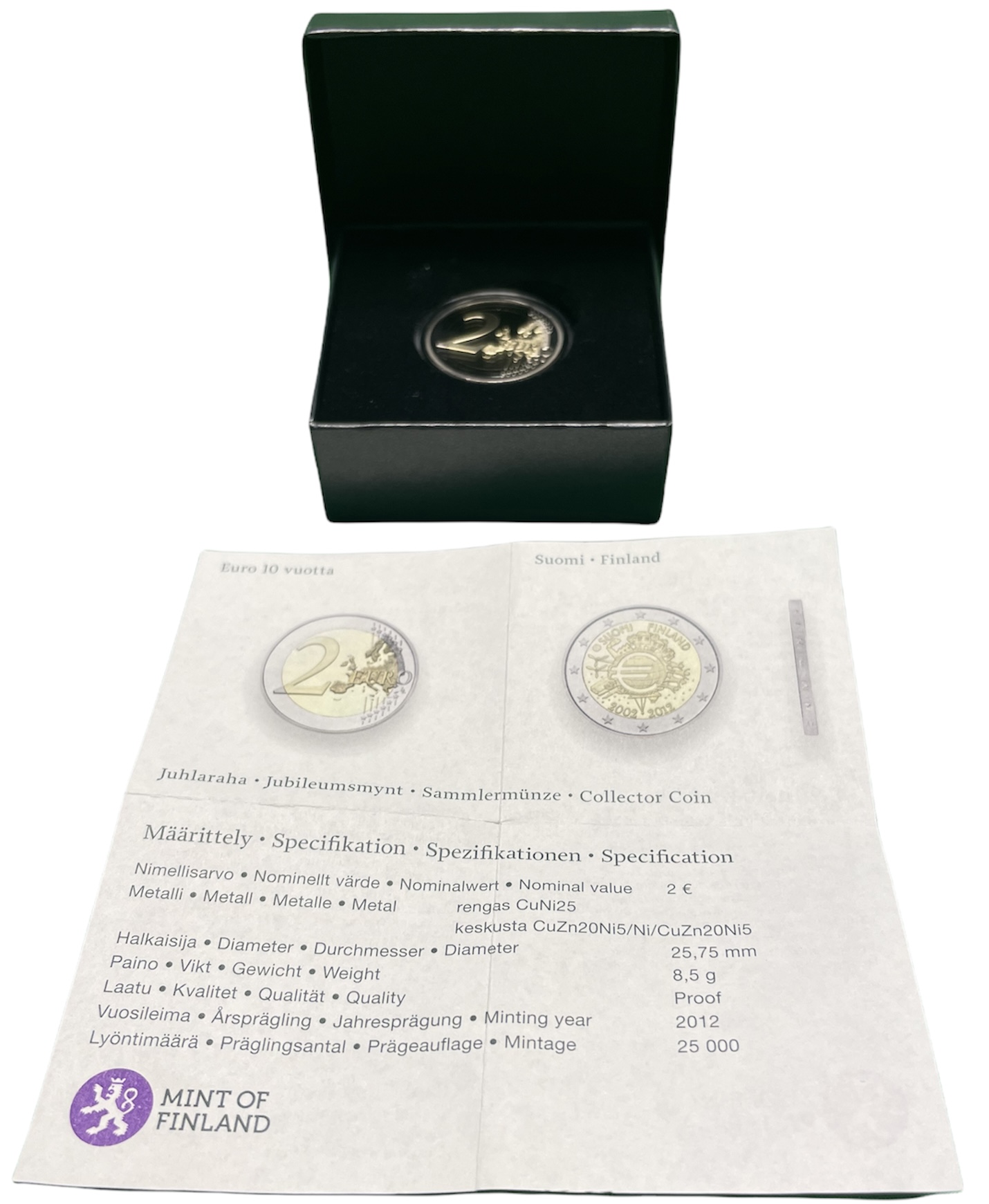 Финляндия 2 евро 2012 10 лет наличному евро, в оригинальной коробке, с сертификатом, тираж 25000 экз. KM биметалл PROOF 7-6-1-41