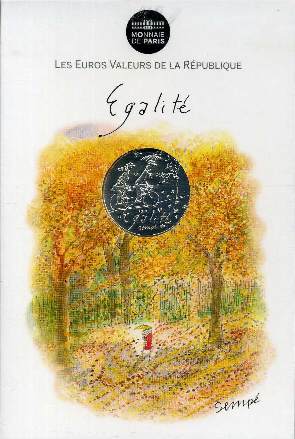 Франция 10 евро 2014 карикатуры Жан-Жака Сампе, осень-равенство, люди с зонтом на велосипеде, в оригинальном буклете KM NEW серебро UNC 1-4-3-09
