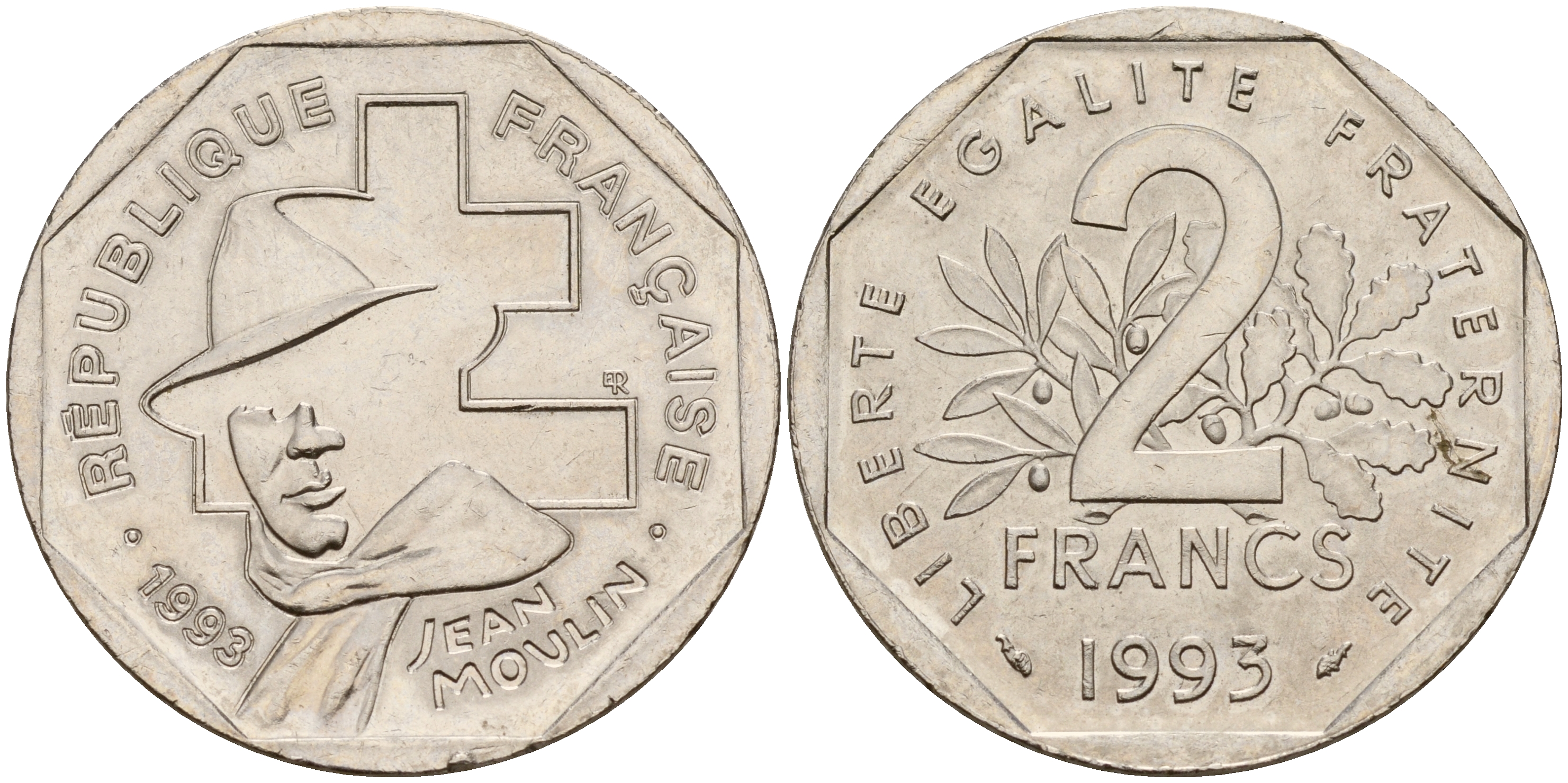 Франция 2 франка 1993 Жан Мулен, 50 лет Национальному движению сопротивления KM 1062, Le Franc 273.2 никель 4601-922