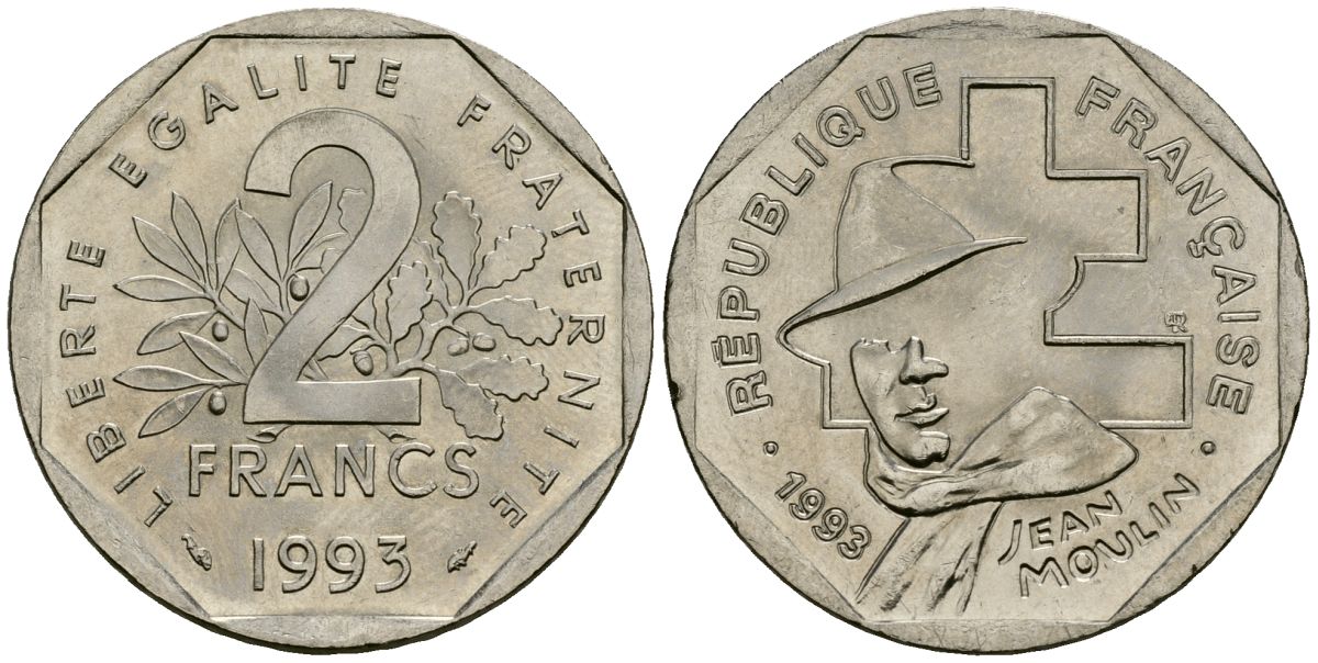 Франция 2 франка 1993 Жан Мулен, 50 лет Национальному движению сопротивления KM 1062, Le Franc 273.2 никель 4120-432