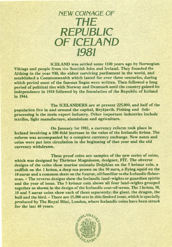 Исландия набор из 5 монет 1981 в оригинальной пластиковой упаковке, с сертификатом, тираж 15000 экземпляров KM PS 4 PROOF 00-00