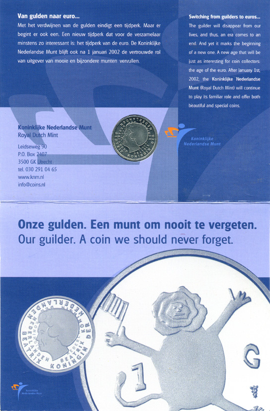 Нидерланды 1 гульден 2001 прощай гульден, детский рисунок, лев с флагом в руках, официальный буклет монетного двора KM 233 никель UNC 2-4-1-04