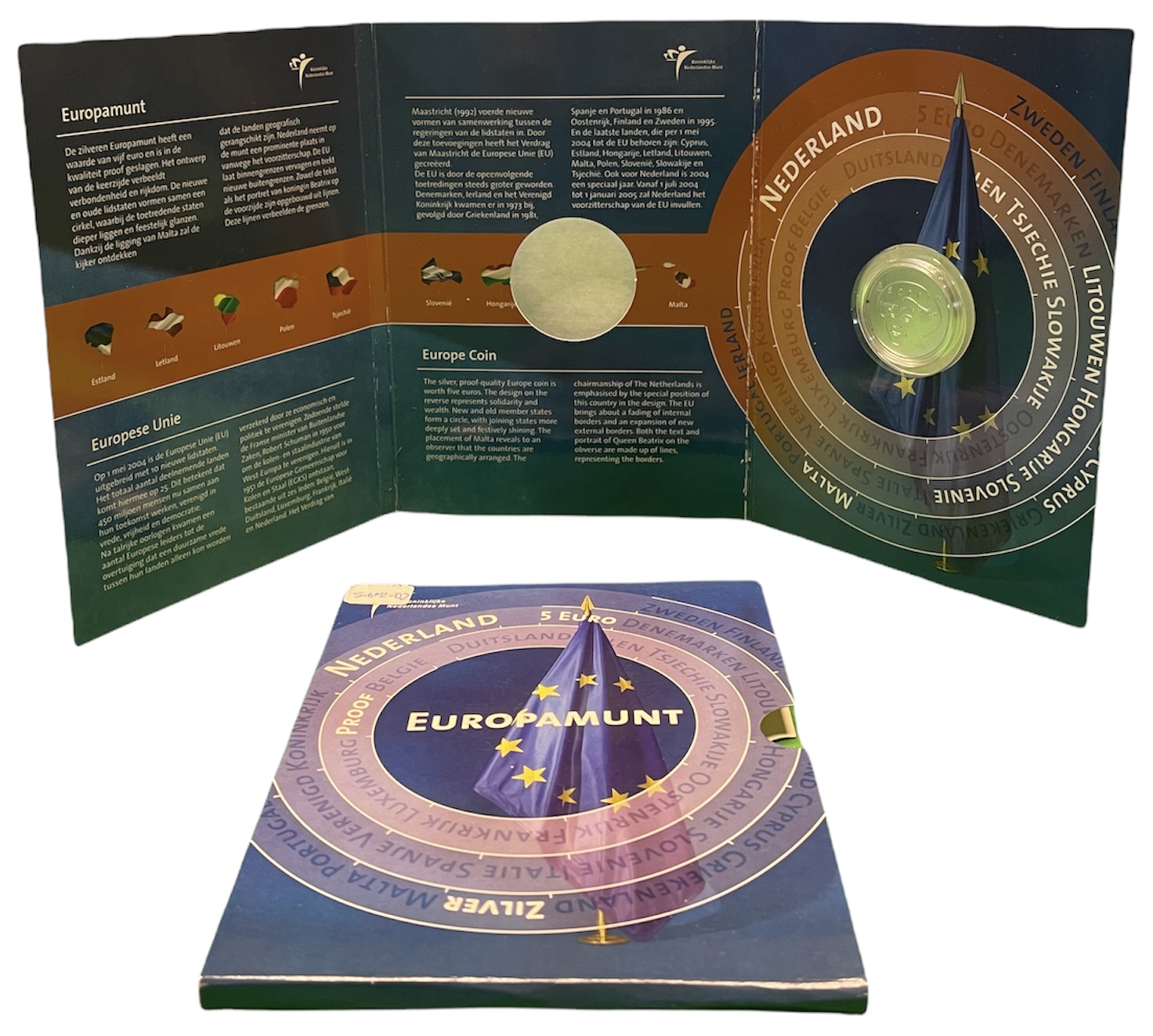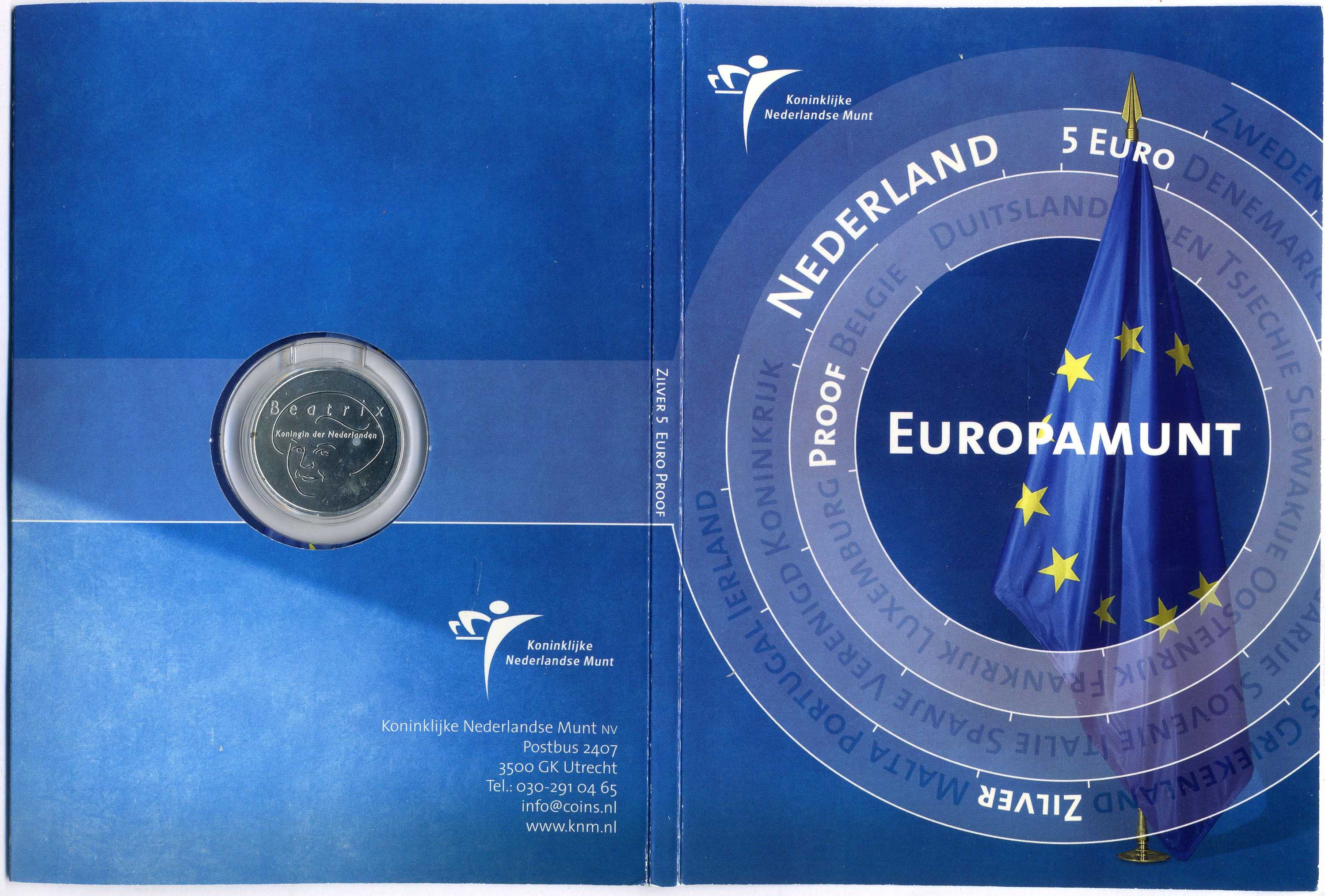 Нидерланды 5 евро 2004 королева Нидерландов Беатрикс, вступление в ЕЭС, в оригинальном картонном буклете KM 252 серебро PROOF 5-6-2-02