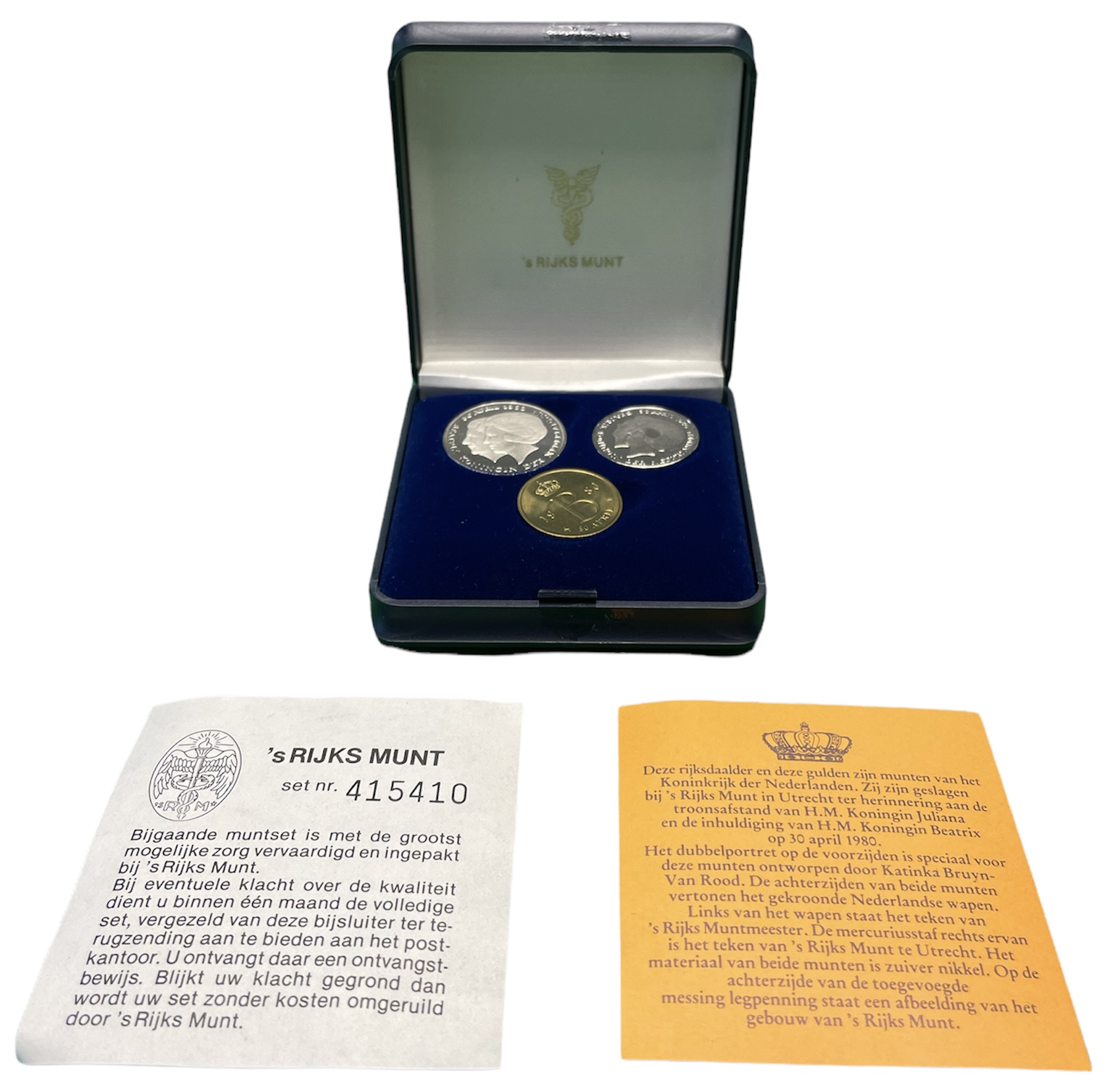 Нидерланды набор из 2 монет 1980 Беатрикс королева Нидерландов, коробка, сертификат, жетон монетного двора UNC 1-6-2-33