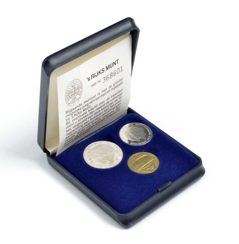 Нидерланды набор из 2 монет 1980 Беатрикс королева Нидерландов, коробка, сертификат, жетон монетного двора UNC 4-3-5-15
