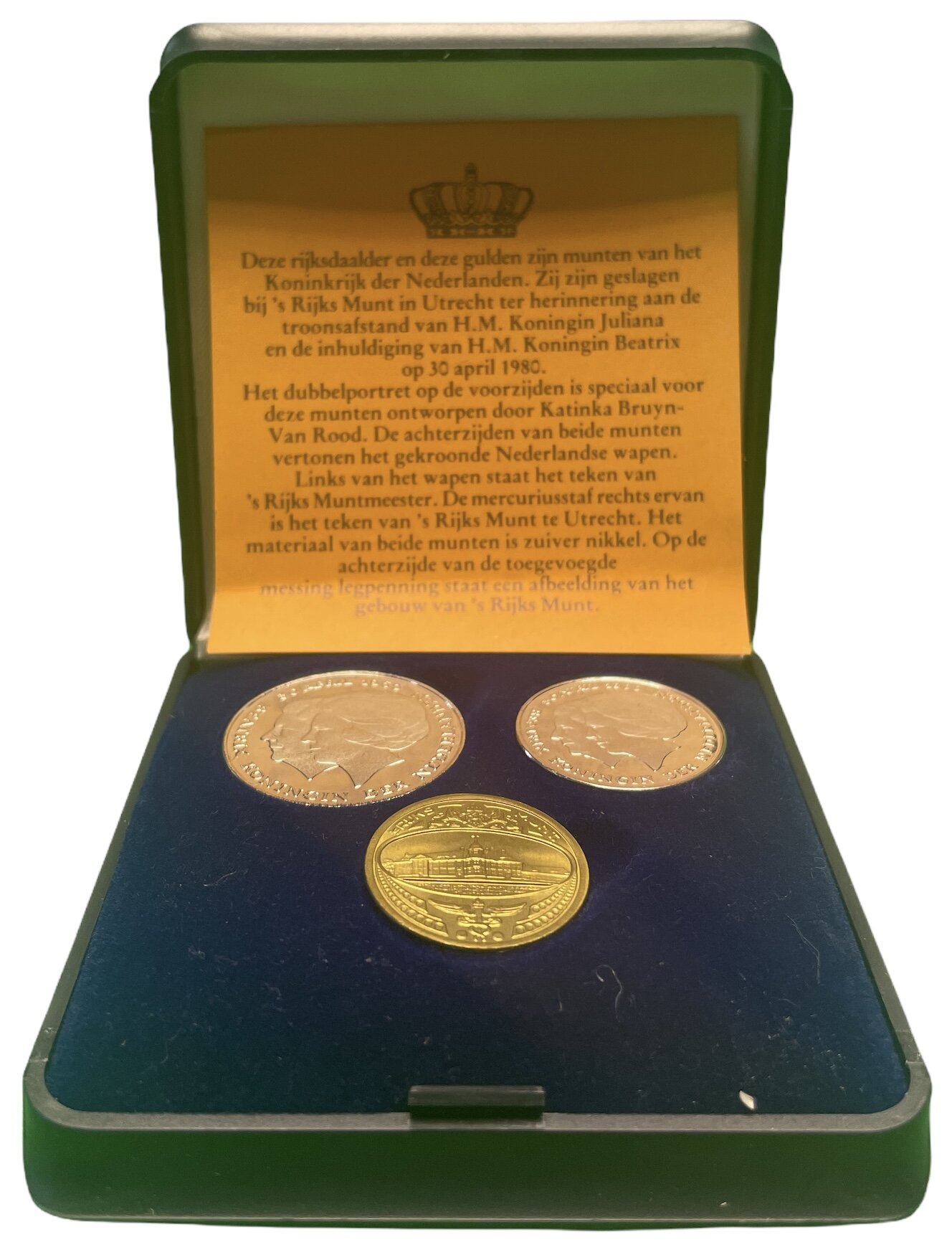 Нидерланды набор из 2 монет + жетон мондвора 1980 30 апреля 1980, коробка, сертификат медно-никель UNC 7-5-1-24