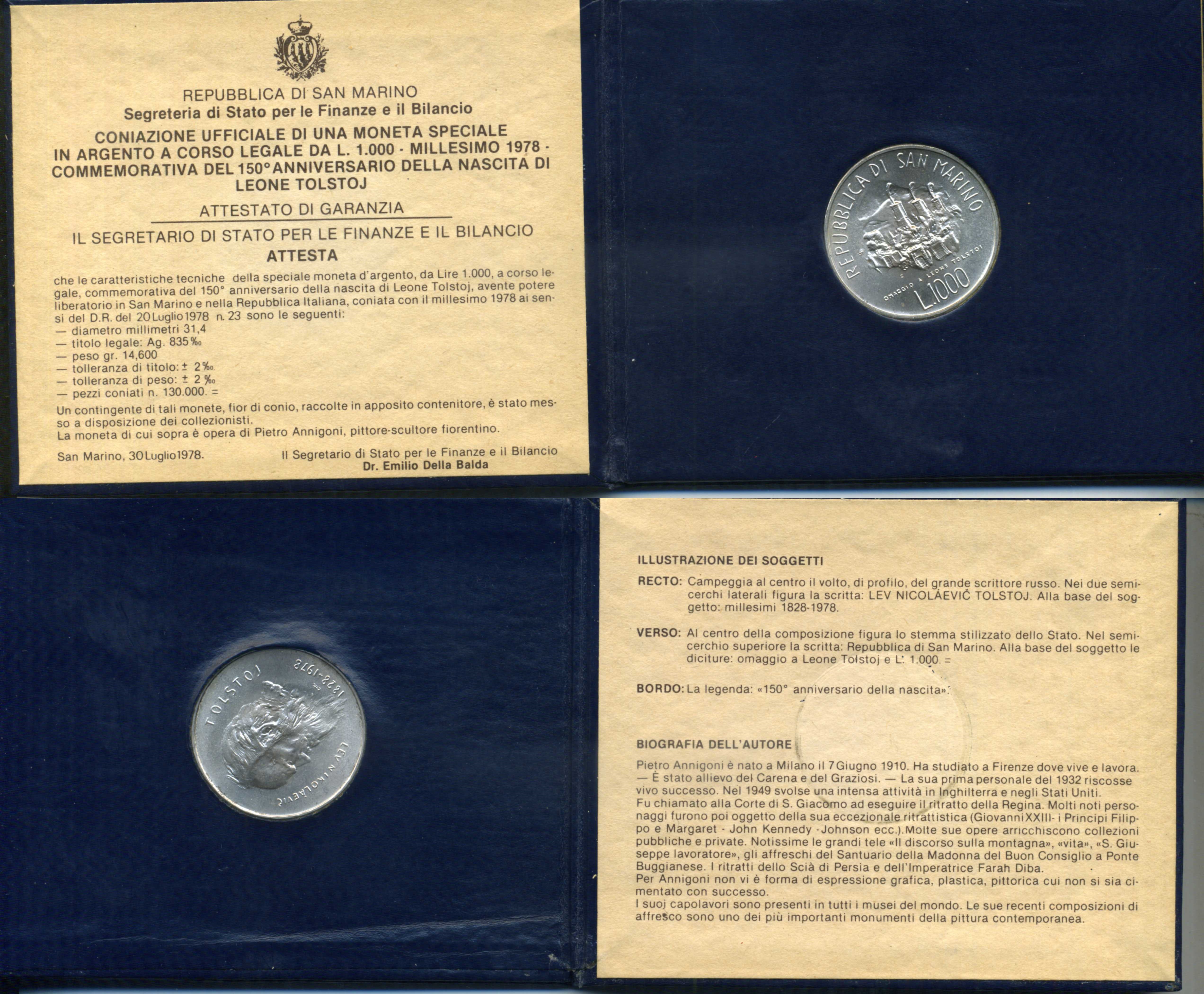 --Сан-Марино 1000 лир 1978 150 лет со дня рождения Льва Николаевича Толстого, в оигинальной упаковке KM 85 серебро UNC 7-4-1-48НовинкиАнтичность и раннее СредневековьеМонеты - ГерманияМонеты - ЕвропаМонеты - Австралия и ОкеанияМонеты - АзияМонеты - АмерикаМонеты - АфрикаМонеты - Россия, СССР, страны СНГ и БалтииБанкнотыАксессуары, ЛитератураОткрытки, карточкиАкции, облигацииЖетоны, Медали, ЗнакиМаркиКартины, декоративно-прикладное искусство