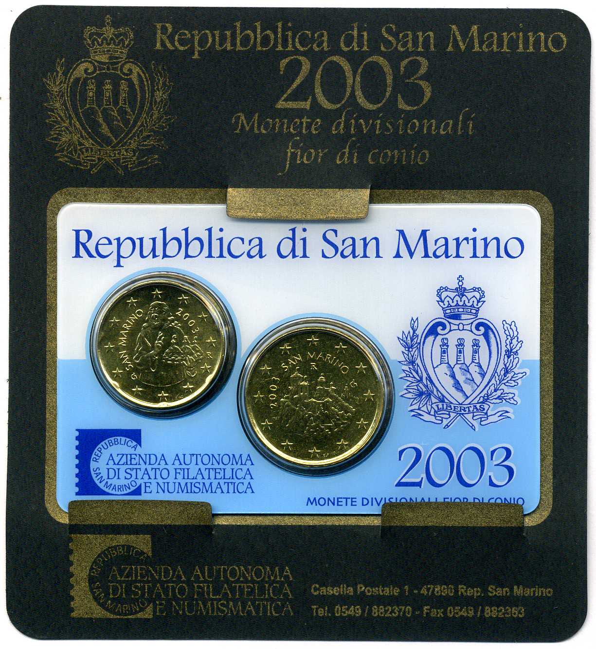 Сан-Марино набор из 2 монет 20 И 50 евроцентов 2003 в оригинальном буклете, запайка в пластик латунь UNC 3-4-3-50