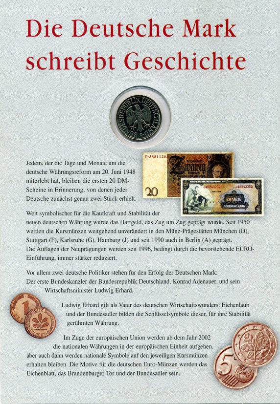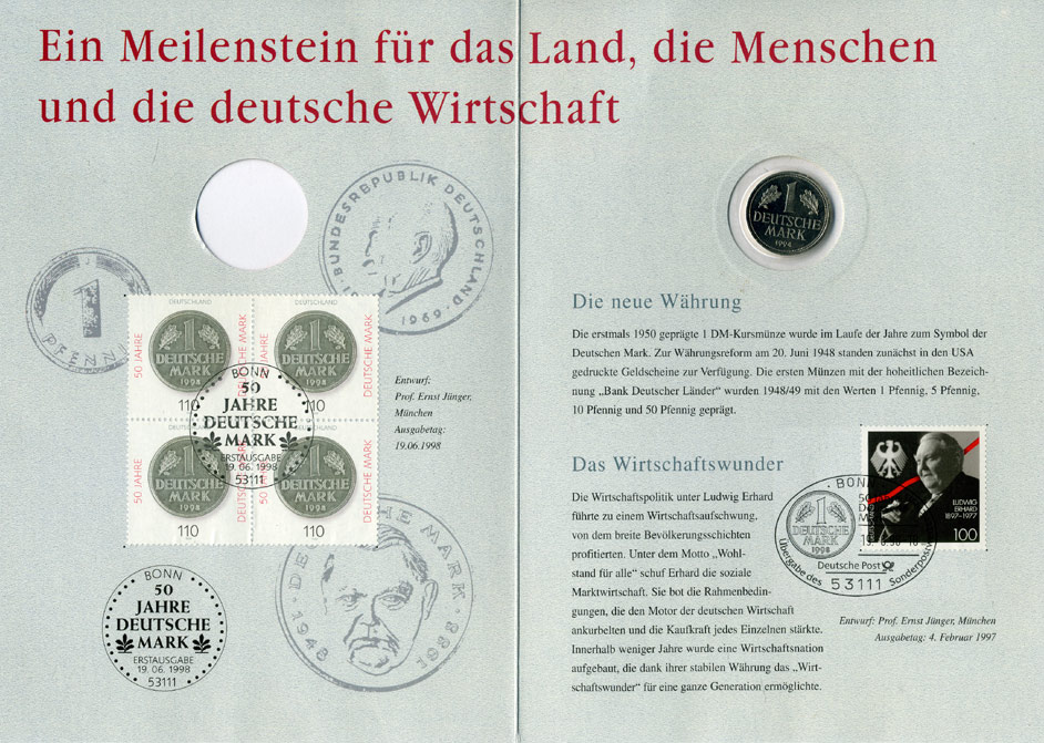 ФРГ 1 марка 1994 D, 50 лет немецкой марке, картонный буклет, официальный выпуск немецкой почты (Deutsche Post) UNC 1-6-4-81