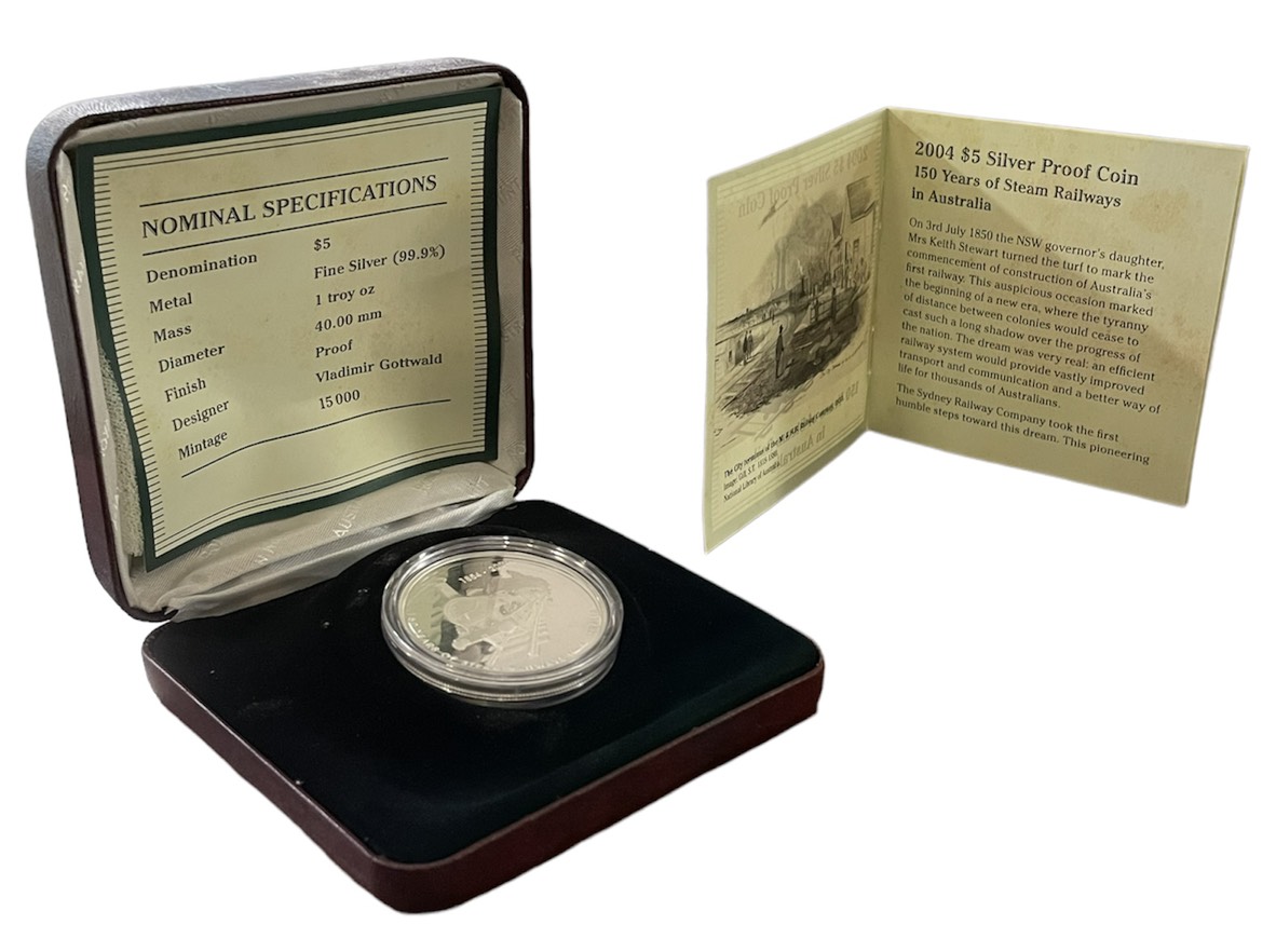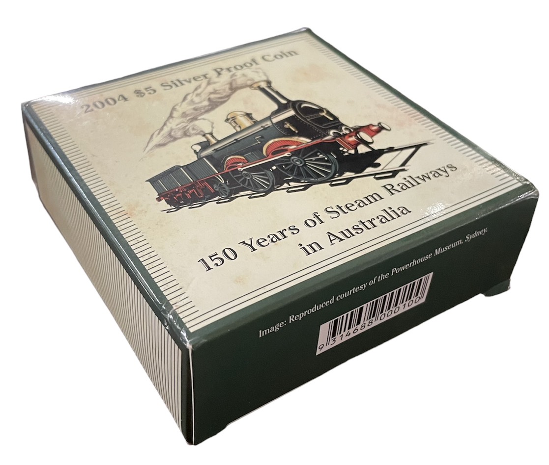 Австралия 5 долларов 2004 150 лет железным дорогам Австралии, в оригинальной коробке с сертификатом KM 730 серебро PROOF 3-4-11-06