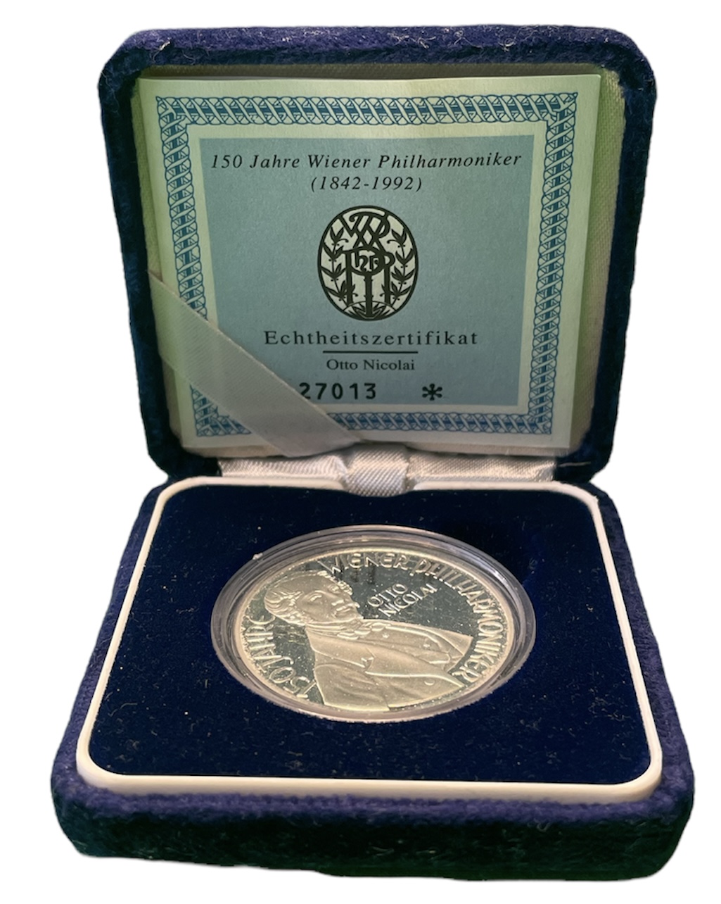 Австрия 100 шиллингов 1992 150 лет Венской филармонии - Отто Николаи, в коробке, с сертификатом подлинности KM 3005 серебро PROOF 3-4-4-10
