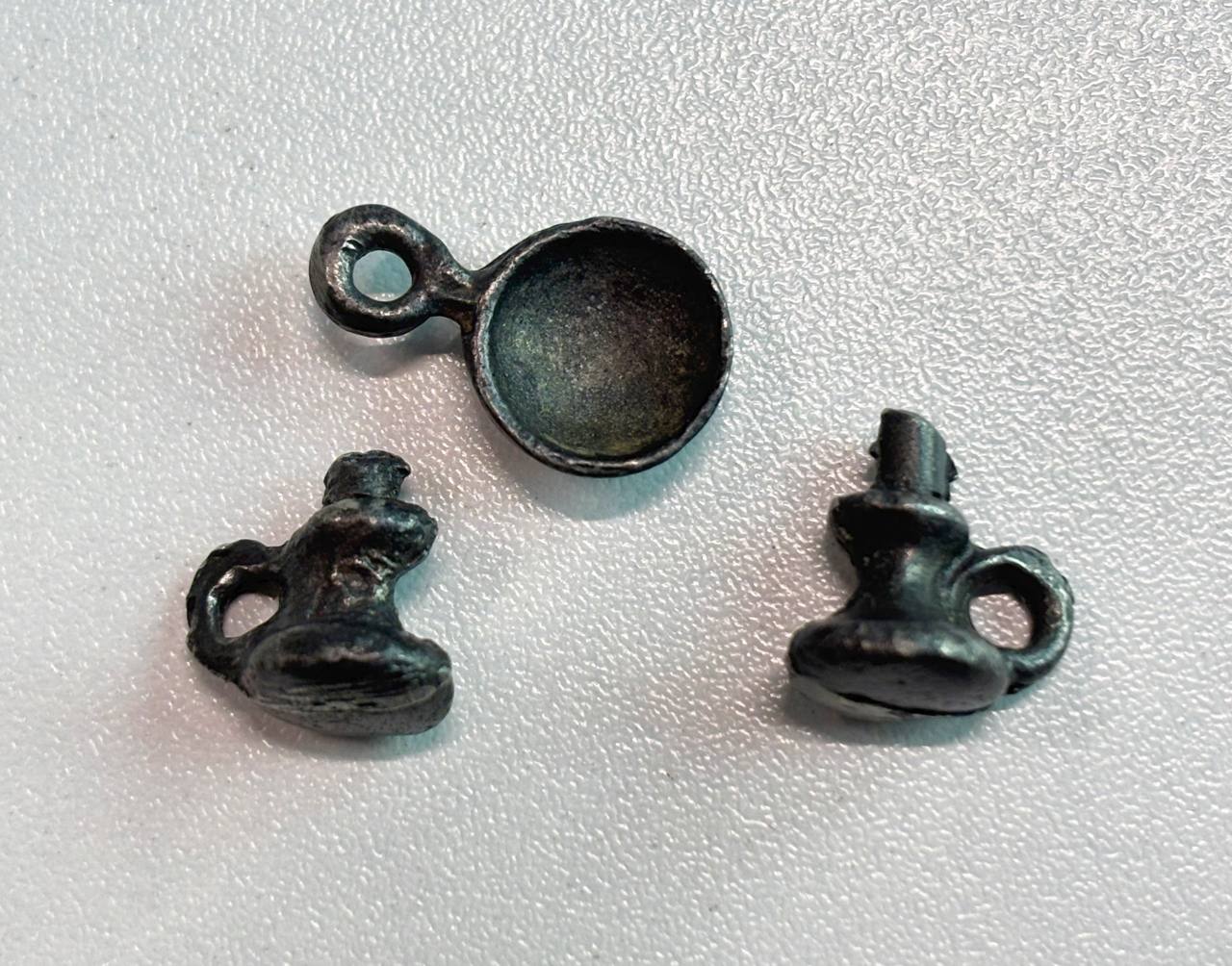 Бельгия набор из 3 декоративно-игровых украшений в виде посуды XIX век "сковородка" - вес 1,81 гр, размер 18,5x4 мм, "чайники" - вес 2,5 гр, размер 13x11 мм олово KOM1-11-14