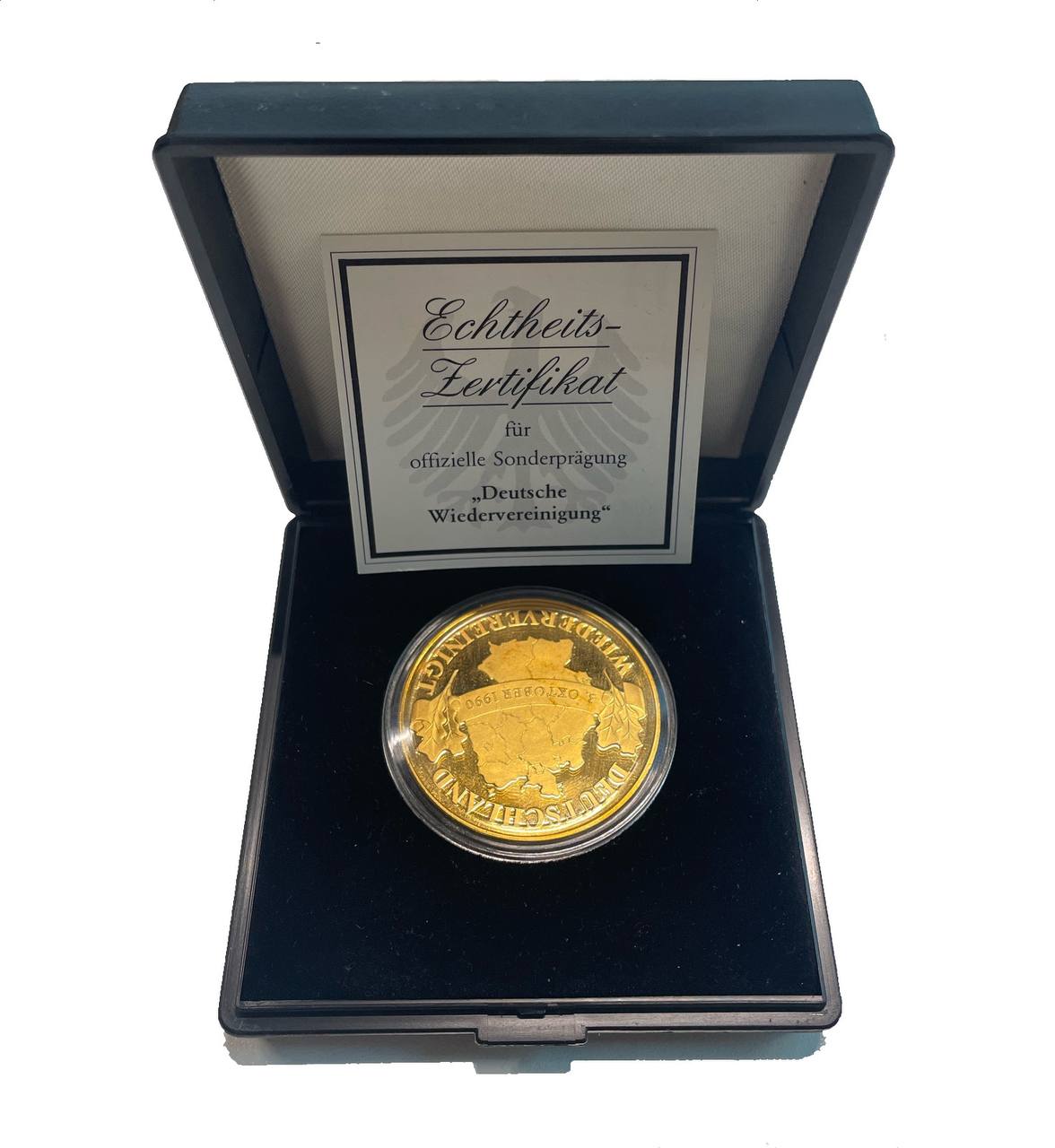 Германия медаль 1990 "Воссоединение Германии", Берлинский Монетный двор, в оригинальной упаковке, с сертификатом подлинности, тираж 25.000 экземпляров, диаметр 40 мм, вес 33,8 гр медно-никель плакированный золотом PROOF 4-5-1-12