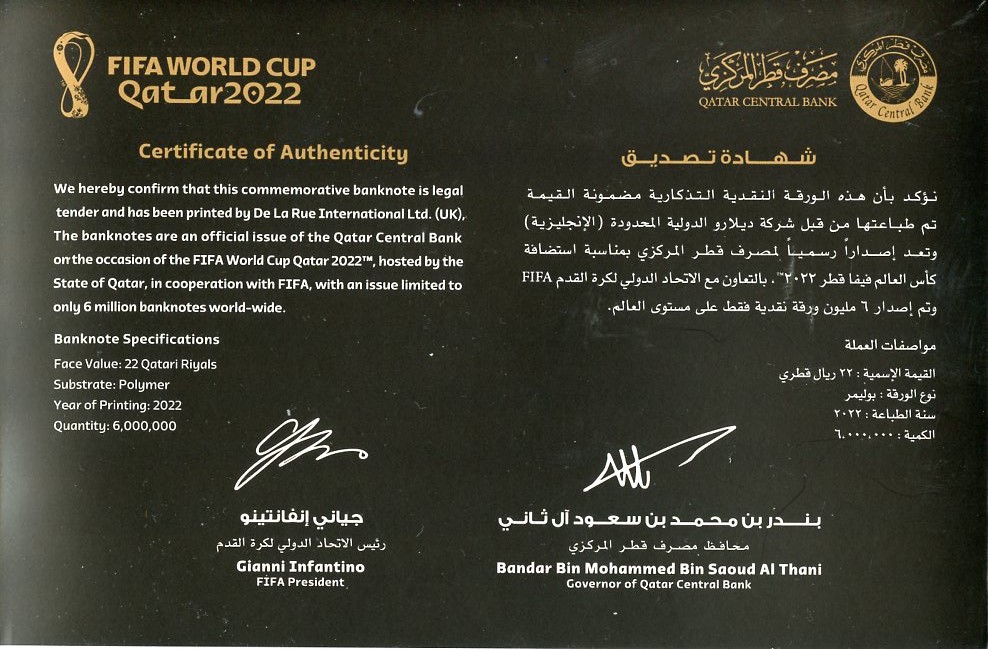 Катар 22 риала 2022 22 ой чемпионат мира по футболу в Катаре, в оригинальном буклете Pick 39 пластик UNC (пресс) 451-293-1