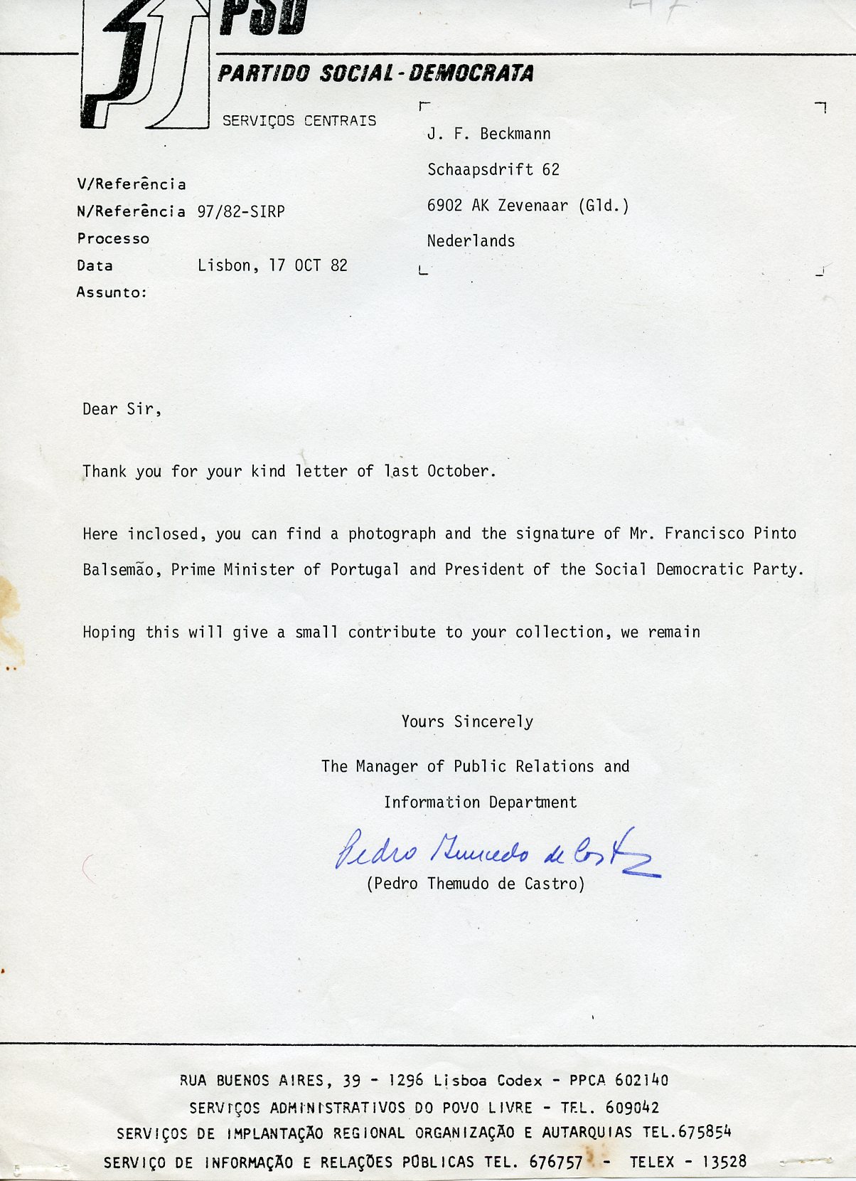 Португалия автограф 1982 фотография с автографом Франсишку Пинту Балсемау и сопроводительное письмо 8805-74-1